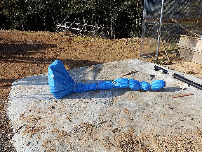 くぬぎ4~5年苗木(ふるい)の梱包はまず下にシートとフイルムを敷き根の部分をくるみます。